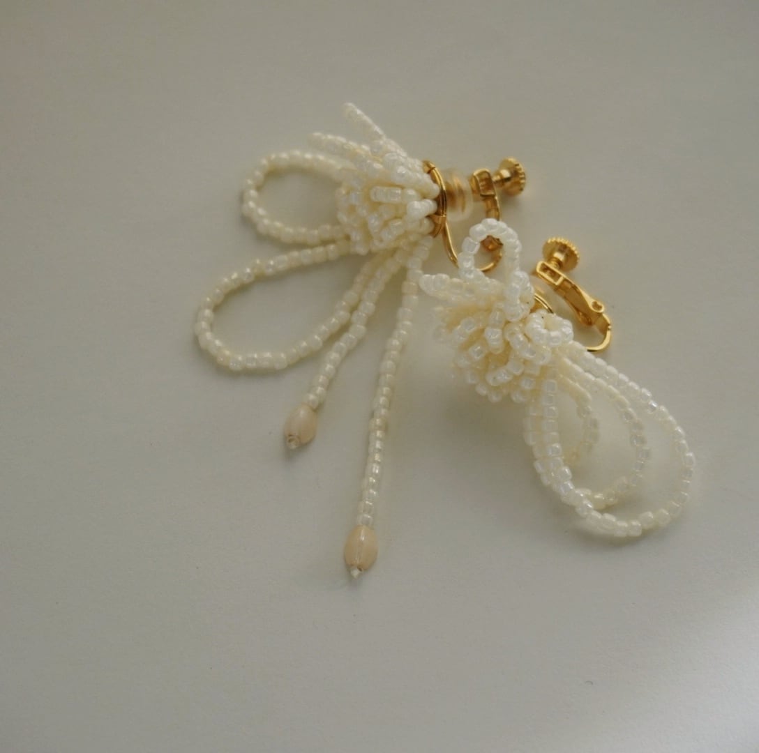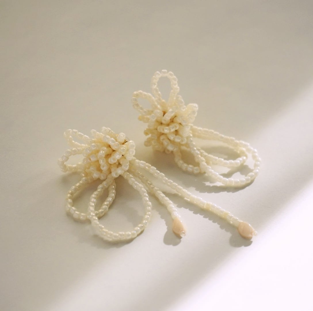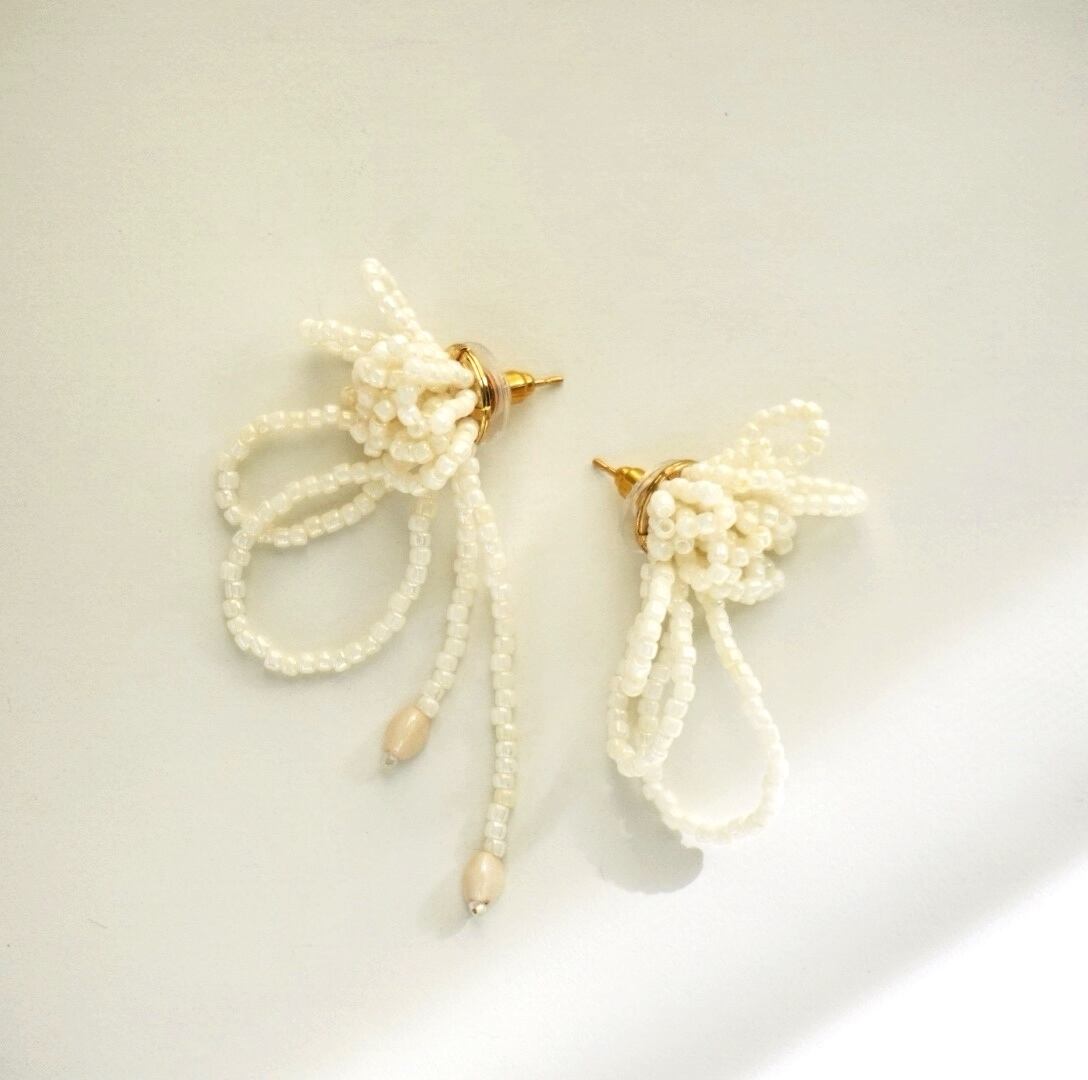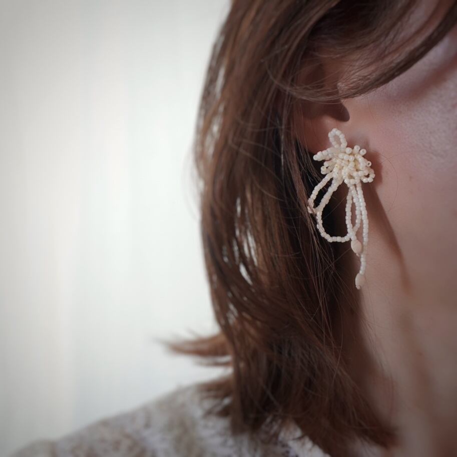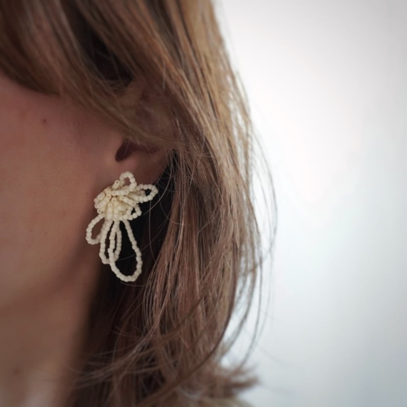 繊細なビーズを幾重にも編み上げた、やわらかな印象のピアスです。
