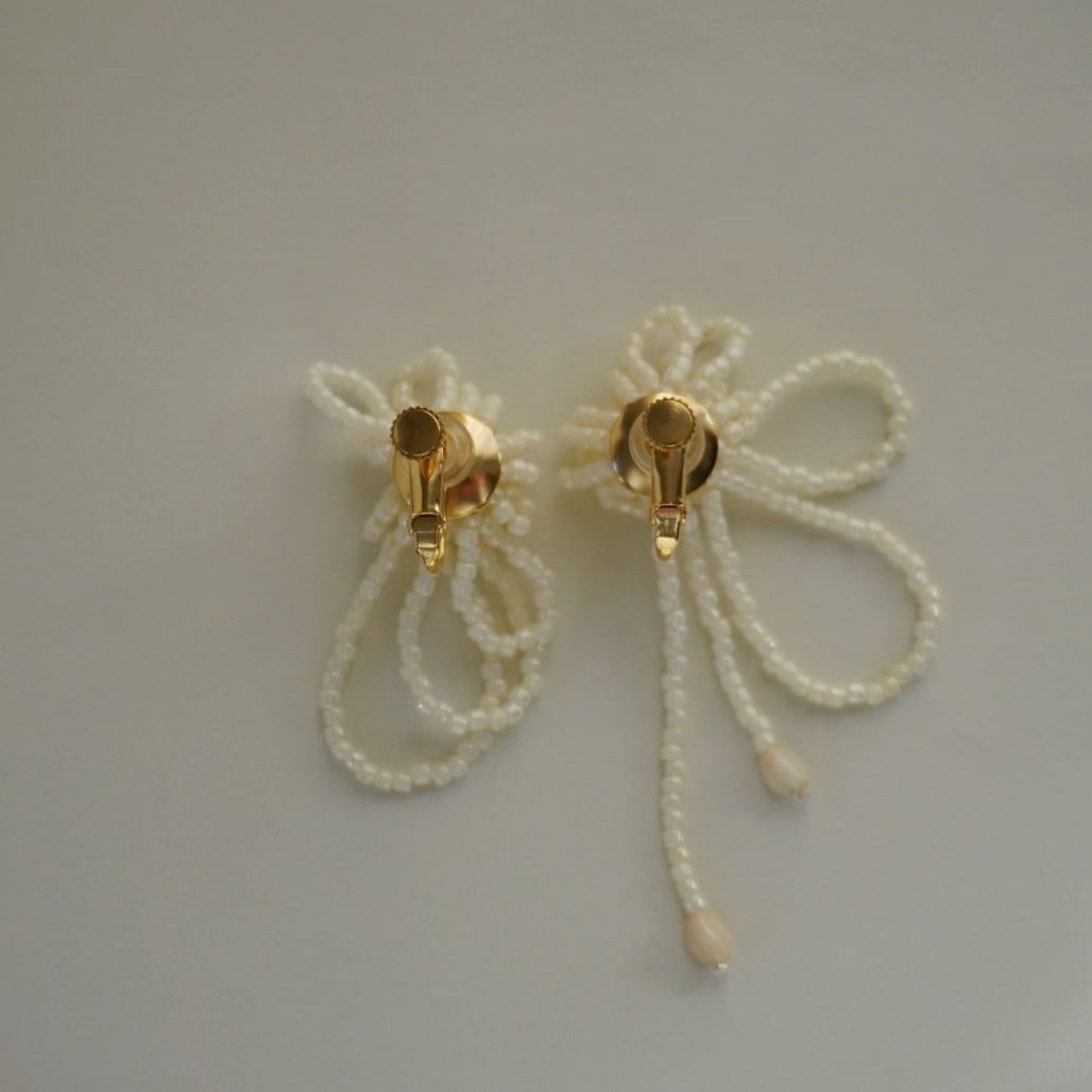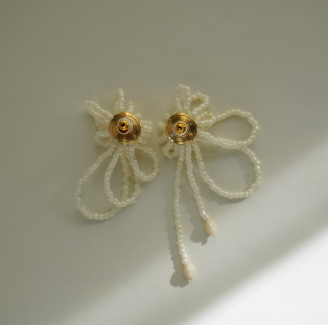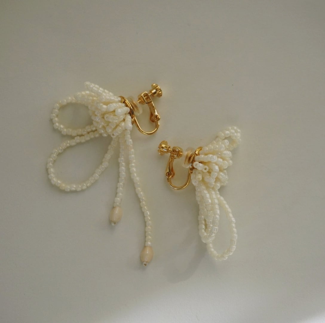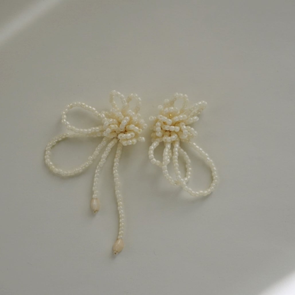 繊細なビーズを幾重にも編み上げた、やわらかな印象のピアスです。
