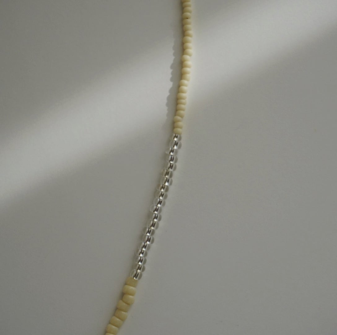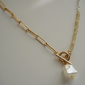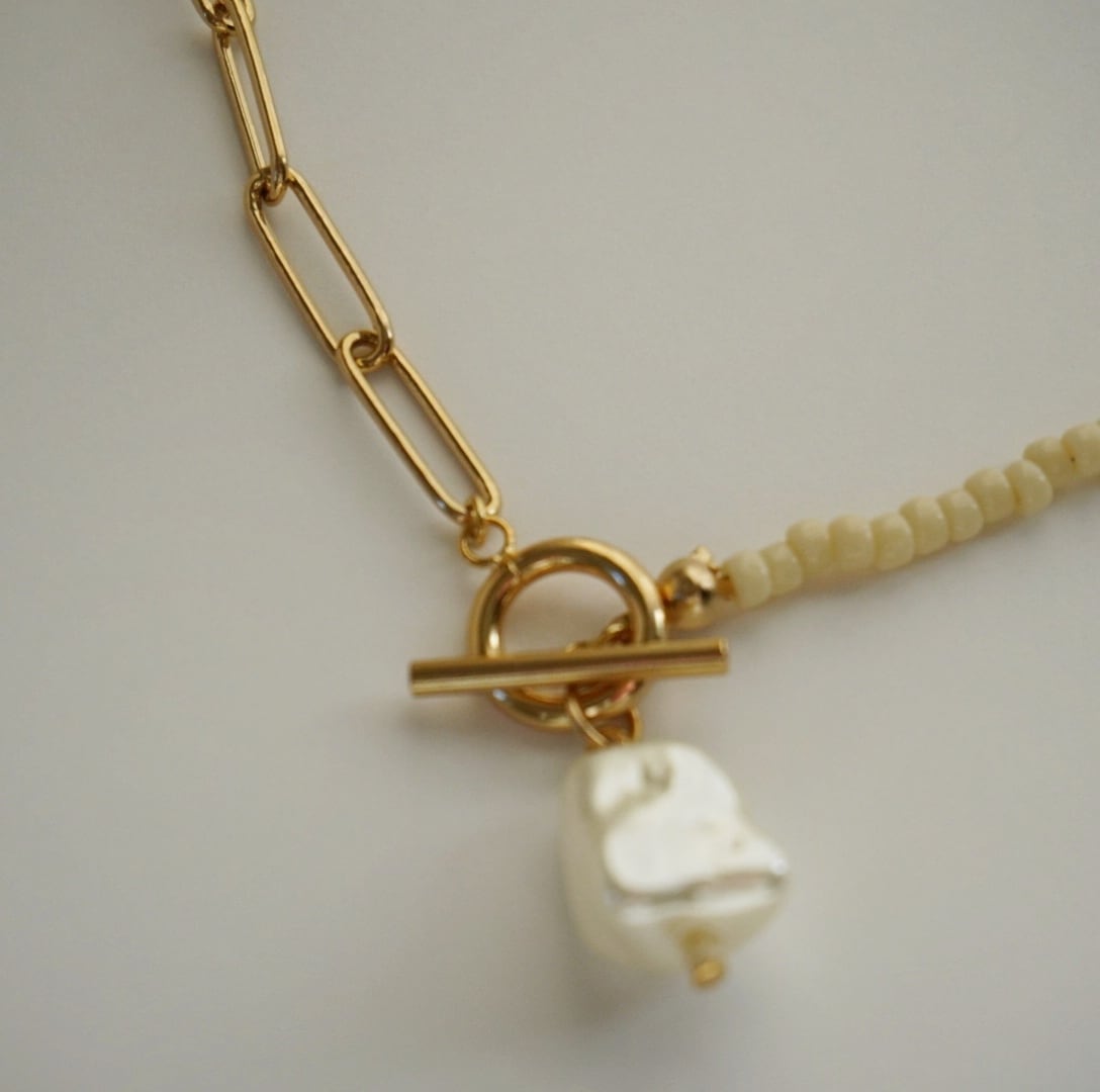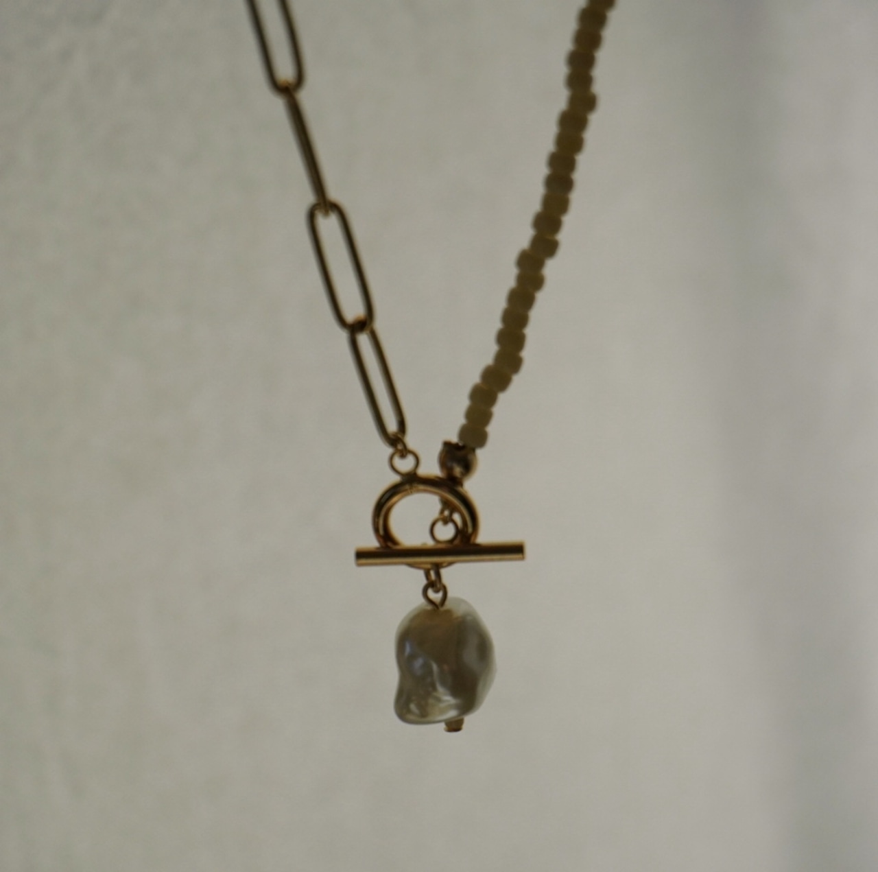淡いアイボリーのビーズと、華奢なゴールドチェーンを組み合わせたネックレス。